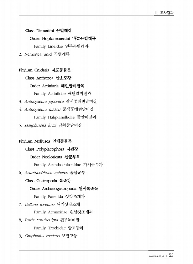 Ⅱ. 조사결과 www.nie.re.kr ? 53 Class Nemertini 끈벌레강 Order Hoplonemertini 바늘끈벌레목 Family Lineidae 연두끈벌레과 2. Nemertea unid 끈벌레류 Phylum Cnidaria 자포동물문 Class Anthozoa 산호충강 Order Actiniaria 해변말미잘목 Family Actiniidae 해변말미잘과 3. Anthopleura japonica 갈색꽃해변말미잘 4. Anthopleura midori 풀색꽃해변말미잘 Family Haliplanellidae 줄말미잘과 5. Haliplanella lucia 담황줄말미잘 Phylum Mollusca 연체동물문 Class Polyplacophora 다판강 Order Neoloricata 신...