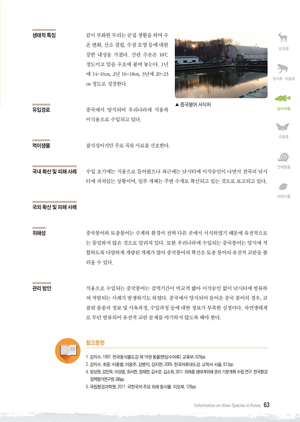 포유류 양서류 · 파충류 담수어류 곤충류 연체동물 외래식물 Imformation on Alien Species in Korea 63 생태적 특징 같이 부화한 무리는 군집 생활을 하며 수 온 변화, 산소 결핍, 수질 오염 등에 대한 강한 내성을 가졌다. 산란 수온은 18℃ 정도이고 알을 수초에 붙여 놓는다. 1년 에 1416㎝, 2년 1618㎝, 3년에 2023 ㎝ 정도로 성장한다. 유입경로 중국에서 양식되어 우리나라에 식용과 이식용으로 수입되고 있다. 먹이생물 잡식성이지만 주로 곡류 사료를 선호한다. 국내 확산 및 피해 사례 수입 초기에는 식용으로 들어왔으나 최근에는 낚시터에 이식승인이 나면서 전국의 낚시 터에 퍼져있는 상황이며, 일부 개체는 주변 수계로 확산되고 있는 것으로 보고되고 있다. 국외 확산 및 ...