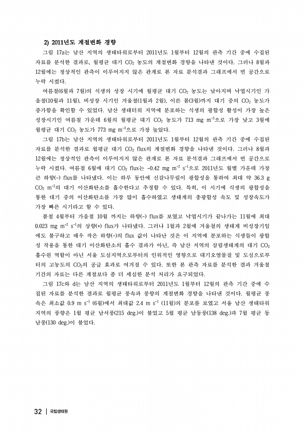 년도 계절변화 경향 그림 17a는 남산 지역의 생태타워로부터 2011년도 1월부터 12월의 관측 기간 중에 수집된 자료를 분석한 결과로, 월평균 대기 CO2 농도의 계절변화 경향을 나타낸 것이다. 그러나 8월과 12월에는 정상적인 관측이 이루어지지 않은 관계로 본 자료 분석결과 그래프에서 빈 공간으로 누락 시켰다. 여름철 6월과 7월 의 식생의 성장 시기에 월평균 대기 CO2 농도는 낮아지며 낙엽시기인 가 을철 10월과 11월 , 비성장 시기인 겨울철 1월과 2월 , 이른 봄 3월 까지 대기 중의 CO2 농도가 증가함을 확인할 수 있었다. 남산 생태터워 지역에 분포하는 식생의 광합성 활성이 가장 높은 성장시기인 여름철 가운데 6월의 월평균 대기 CO2 농도가 713 mg m-3으로 가장 낮고 3월에 월평균 ...