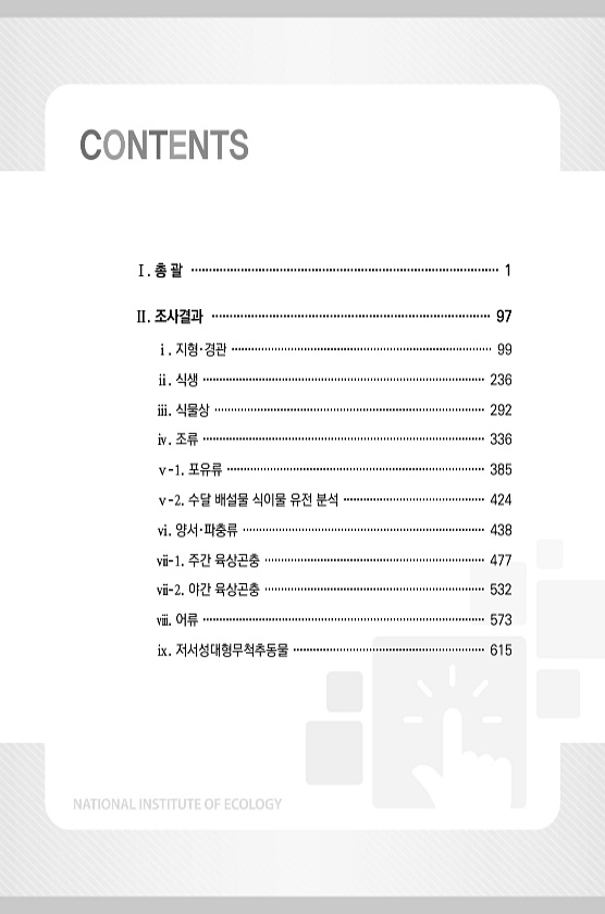 Ⅰ. 총 괄 ······················································································· 1 Ⅱ. 조사결과 ·············································································· 97 ⅰ. 지형·경관 ··············································································· 99 ⅱ. 식생 ······················································································ 236 ⅲ. 식물상 ·················...