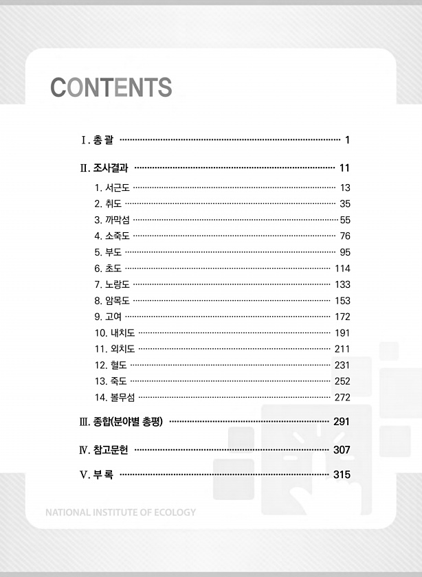 Ⅰ. 총 괄 ······················································································· 1 Ⅱ. 조사결과 ··············································································· 11 1. 서근도 ······················································································ 13 2. 취도 ························································································· 35 3. 까막섬 ·········...
