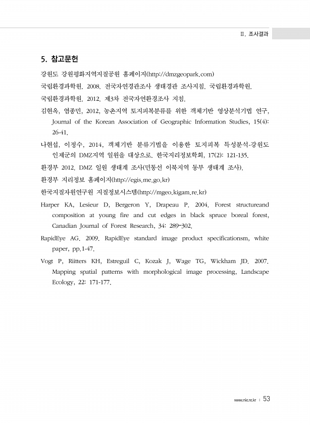 Ⅱ. 조사결과 www.nie.re.kr ? 53 5. 참고문헌 강원도 강원평화지역지질공원 홈페이지 http//dmzgeopark.com 국립환경과학원. 2008. 전국자연경관조사 생태경관 조사지침. 국립환경과학원. 국립환경과학원. 2012. 제3차 전국자연환경조사 지침. 김현옥, 염종민, 2012, 농촌지역 토지피복분류를 위한 객체기반 영상분석기법 연구, Journal of the Korean Association of Geographic Information Studies, 15 4 26-41. 나현섭, 이정수, 2014, 객체기반 분류기법을 이용한 토지피복 특성분석-강원도 인제군의 DMZ지역 일원을 대상으로. 한국지리정보학회, 17 2 121-135. 환경부 2012. DMZ 일원 생태계 조사 민통선 이...