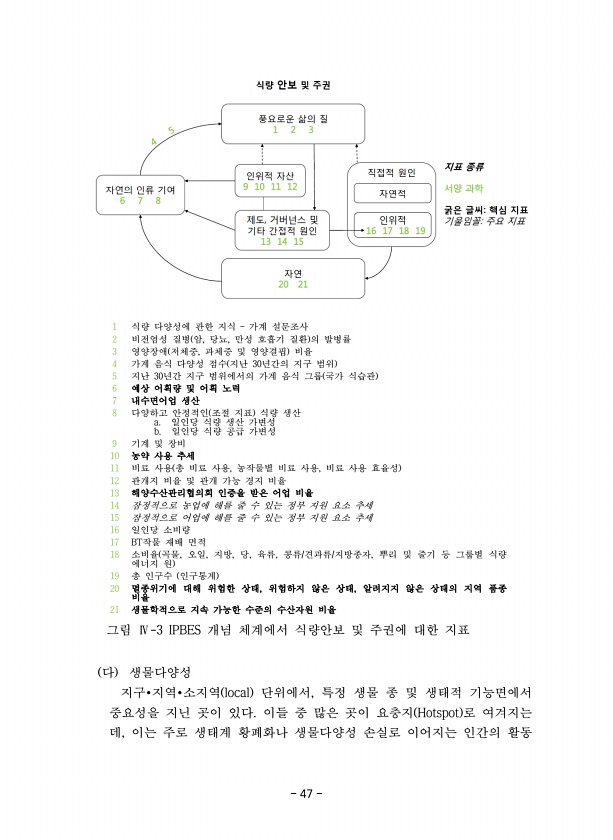 47 1 식량 다양성에 관한 지식 ? 가계 설문조사 2 비전염성 질병 암, 당뇨, 만성 호흡기 질환 의 발병률 3 영양장애 저체중, 과체중 및 영양결핍 비율 4 가계 음식 다양성 점수 지난 30년간의 지구 범위 5 지난 30년간 지구 범위에서의 가계 음식 그룹 국가 식습관 6 예상 어획량 및 어획 노력 7 내수면어업 생산 8 다양하고 안정적인 조절 지표 식량 생산 a. 일인당 식량 생산 가변성 b. 일인당 식량 공급 가변성 9 기계 및 장비 10 농약 사용 추세 11 비료 사용 총 비료 사용, 농작물별 비료 사용, 비료 사용 효율성 12 관개지 비율 및 관개 가능 경지 비율 13 해양수산관리협의회 인증을 받은 어업 비율 14 잠정적으로 농업에 해를 줄 수 있는 정부 지원 요소 추세 15 잠정적으로 어업에 해...