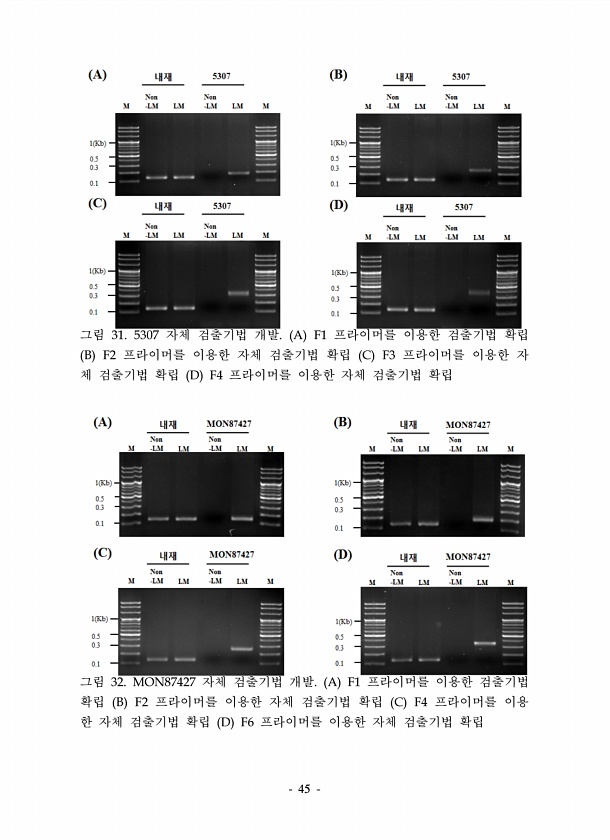 45 그림 31. 5307 자체 검출기법 개발. A F1 프라이머를 이용한 검출기법 확립 B F2 프라이머를 이용한 자체 검출기법 확립 C F3 프라이머를 이용한 자 체 검출기법 확립 D F4 프라이머를 이용한 자체 검출기법 확립 그림 32. MON87427 자체 검출기법 개발. A F1 프라이머를 이용한 검출기법 확립 B F2 프라이머를 이용한 자체 검출기법 확립 C F4 프라이머를 이용 한 자체 검출기법 확립 D F6 프라이머를 이용한 자체 검출기법확립