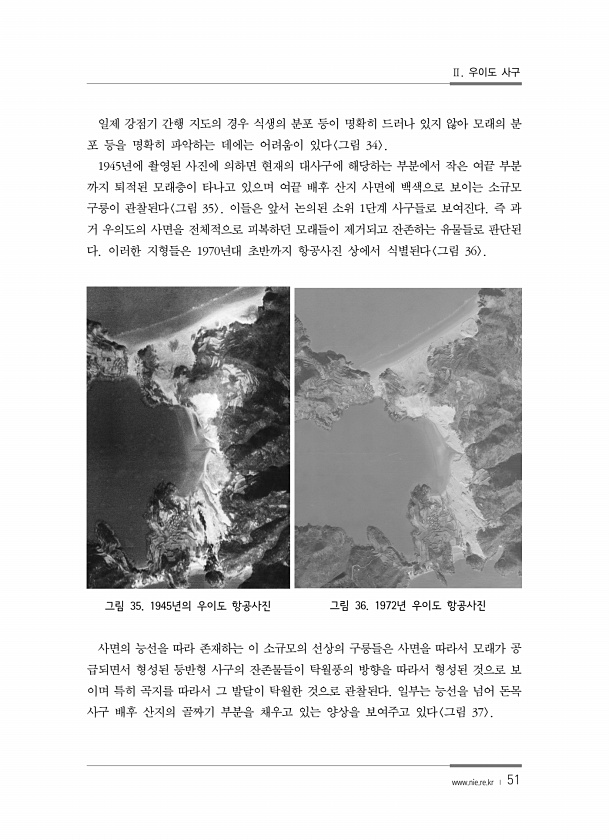 Ⅱ. 우이도 사구 www.nie.re.kr ? 51 일제 강점기 간행 지도의 경우 식생의 분포 등이 명확히 드러나 있지 않아 모래의 분 포 등을 명확히 파악하는 데에는 어려움이 있다 그림 34 1945년에 촬영된 사진에 의하면 현재의 대사구에 해당하는 부분에서 작은 여끝 부분 까지 퇴적된 모래층이 타나고 있으며 여끝 배후 산지 사면에 백색으로 보이는 소규모 구릉이 관찰된다 그림 35 이들은 앞서 논의된 소위 1단계 사구들로 보여진다. 즉 과 거 우의도의 사면을 전체적으로 피복하던 모래들이 제거되고 잔존하는 유물들로 판단된 다. 이러한 지형들은 1970년대 초반까지 항공사진 상에서 식별된다 그림 36 그림 35. 1945년의 우이도 항공사진 그림 36. 1972년 우이도 항공사진 사면의 능선을 따라 존재하는 ...