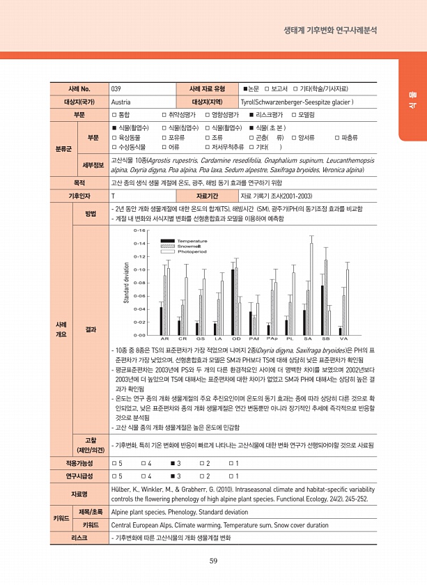 59 생태계 기후변화 연구사례분석 식 물 사례 No. 039 사례 자료 유형 ■논문 □ 보고서 □ 기타 학술/기사자료 대상지 국가 Austria 대상지 지역 Tyrol Schwarzenberger-Seespitze glacier 부문 □ 통합 □ 취약성평가 □ 영향성평가 ■ 리스크평가 □ 모델링 분류군 부문 ■ 식물 활엽수 □ 식물 침엽수 □ 식물 활엽수 ■ 식물 초 본 □ 육상동물 □ 포유류 □ 조류 □ 곤충 류 □ 양서류 □ 파충류 □ 수상동식물 □ 어류 □ 저서무척추류 □ 기타 세부정보 고산식물 10종 Agrostis rupestris, Cardamine resedifolia, Gnaphalium supinum, Leucanthemopsis alpina, Oxyria digyna, Poa alpina,...