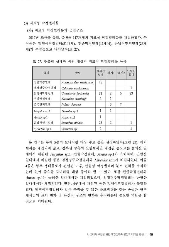 49 지표성 딱정벌레류 가 지표성 딱정벌레류의 군집구조 년 조사를 통해 총 종 개체의 지표성 딱정벌레류를 채집하였다 우 점종은 멋쟁이딱정벌레 개체 민줄딱정벌레 개체 윤납작먼지벌레 개 체 가 우점종으로 나타났다 표 국명 학명 눌의산 일대 패치 패치 난함산 일대 민줄딱정벌레 45 검정명주딱정벌레 1 멋쟁이딱정벌레 21 2 5 23 우리딱정벌레 2 1 중국먼지벌레 6 7 1 1 1 윤납작먼지벌레 23 2 1 4 1 표 추풍령 생태축 복원 대상지 지표성 딱정벌레류 목록 본 연구를 통해 종의 모니터링 대상 주요 종을 선정하였다 그림 패치 에서는 채집되지 않고 경부선 양측의 산림에서만 채집된 종으로는 눌의산 일 대에서 채집된 민줄딱정벌레 가 유이하며 난함산 일대에서 채집된 종은 검정명주딱정벌레와 가 채집되었다 이들 종...