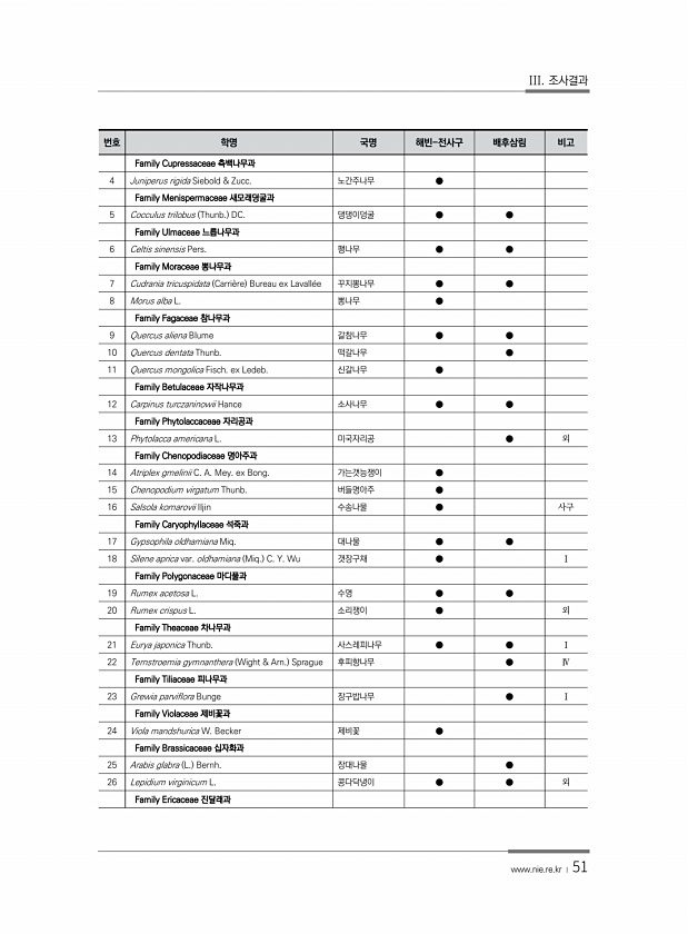 III. 조사결과 www.nie.re.kr ? 51 번호 학명 국명 해빈-전사구 배후삼림 비고 Family Cupressaceae 측백나무과 4 Juniperus rigida Siebold & Zucc. 노간주나무 ● Family Menispermaceae 새모래덩굴과 5 Cocculus trilobus Thunb. DC. 댕댕이덩굴 ● ● Family Ulmaceae 느릅나무과 6 Celtis sinensis Pers. 팽나무 ● ● Family Moraceae 뽕나무과 7 Cudrania tricuspidata Carrie?re Bureau ex Lavalle?e 꾸지뽕나무 ● ● 8 Morus alba L. 뽕나무 ● Family Fagaceae 참나무과 9 Quercus aliena Blume 갈참나...