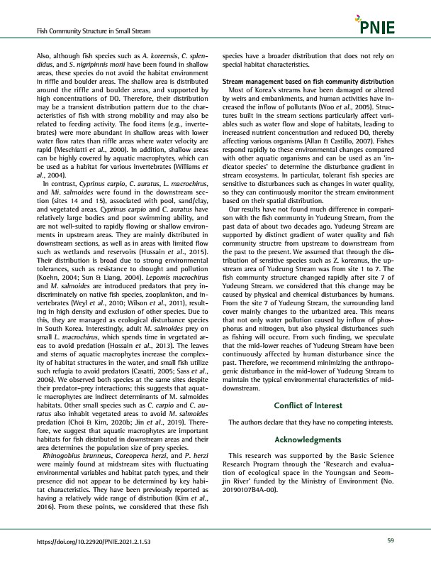 Fish Community Structure in Small Stream https//doi.org/10.22920/PNIE.2021.2.1.53 59 Also, although fish species such as A. koreensis, C. splendidus, and S. nigripinnis morii have been found in shallow areas, these species do not avoid the habitat environment in riffle and boulder areas. The shallow area is distributed around the riffle and boulder areas, and supported by high concentrations of DO...