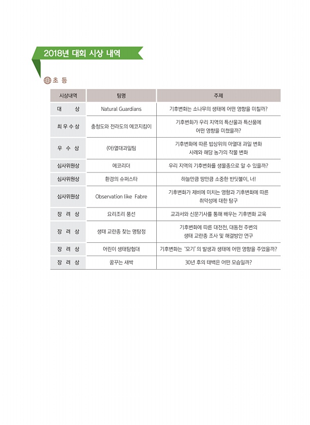 2018년 대회 시상 내역 초 등 시상내역 팀명 주제 대 상 Natural Guardians 기후변화는 소나무의 생태에 어떤 영향을 미칠까? 최 우 수 상 충청도와 전라도의 에코지킴이 기후변화가 우리 지역의 특산물과 특산품에 어떤 영향을 미쳤을까? 우 수 상 아 열대과일팀 기후변화에 따른 밥상위의 아열대 과일 변화 사례와 해당 농가의 작물 변화 심사위원상 에코리더 우리 지역의 기후변화를 생물종으로 알 수 있을까? 심사위원상 환경의 슈퍼스타 하늘만큼 땅만큼 소중한 반딧불이, 너! 심사위원상 Observation like Fabre 기후변화가 제비에 미치는 영향과 기후변화에 따른 취약성에 대한 탐구 장 려 상 요리조리 풍선 교과서와 신문기사를 통해 배우는 기후변화 교육 장 려 상 생태 교란종 찾는 명탐정 기후변...