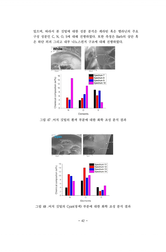 42 있으며, 따라서 본 깃털에 대한 성분 분석은 케라틴 혹은 멜라닌의 주요 구성 성분인 C, N, O, S에 대해 진행하였다. 또한 측정은 Barb의 상단 혹 은 하단 외피 그리고 내부 나노스펀지 구조에 대해 진행하였다. 그림 47 .어치 깃털의 흰색 부분에 대한 화학 조성 분석 결과 그림 48 .어치 깃털의 Cyan 청색 부분에 대한 화학 조성 분석결과