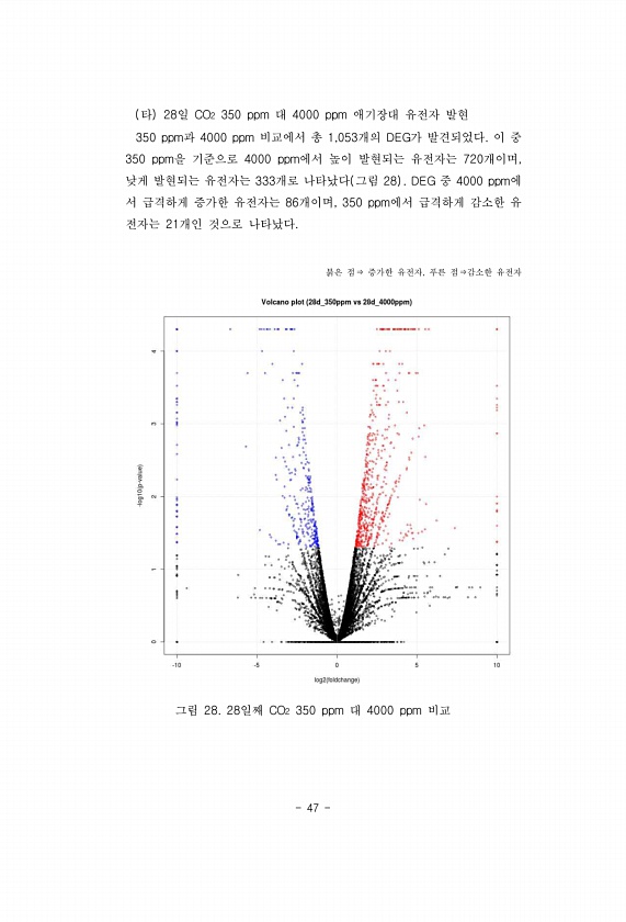 47 타 28일 CO2 350 ppm 대 4000 ppm 애기장대 유전자 발현 350 ppm과 4000 ppm 비교에서 총 1,053개의 DEG가 발견되었다. 이 중 350 ppm을 기준으로 4000 ppm에서 높이 발현되는 유전자는 720개이며, 낮게 발현되는 유전자는 333개로 나타났다 그림 28 DEG 중 4000 ppm에 서 급격하게 증가한 유전자는 86개이며, 350 ppm에서 급격하게 감소한 유 전자는 21개인 것으로 나타났다. 붉은 점⇒ 증가한 유전자, 푸른 점⇒감소한 유전자 그림 28. 28일째 CO2 350 ppm 대 4000 ppm비교
