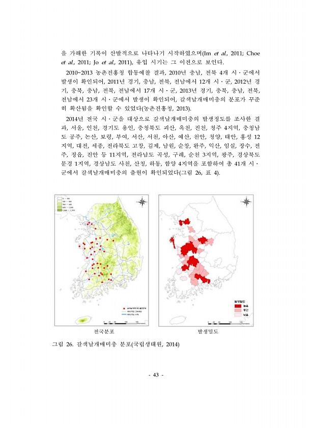 43 을 가해한 기록이 산발적으로 나타나기 시작하였으며 Im et al., 2011; Choe et al., 2011; Jo et al., 2011 , 유입 시기는 그 이전으로 보인다. 20102013 농촌진흥청 합동예찰 결과, 2010년 충남, 전북 4개 시?군에서 발생이 확인되어, 2011년 경기, 충남, 전북, 전남에서 12개 시?군, 2012년 경 기, 충북, 충남, 전북, 전남에서 17개 시?군, 2013년 경기, 충북, 충남, 전북, 전남에서 23개 시?군에서 발생이 확인되어, 갈색날개매미충의 분포가 꾸준 히 확산됨을 확인할 수 있었다 농촌진흥청, 2013 2014년 전국 시?군을 대상으로 갈색날개매미충의 발생정도를 조사한 결 과, 서울, 인천, 경기도 용인, 충청북도 괴산, 옥천, 진천, 청주 ...