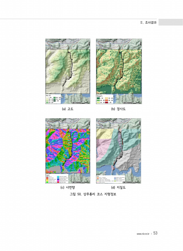 Ⅱ. 조사결과 www.nie.re.kr ? 53 a 고도 b 경사도 c 사면향 d 지질도 그림 50. 상무룡리 코스지형정보