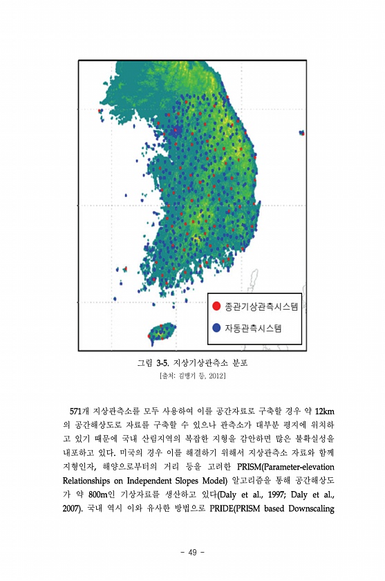 49 그림 지상기상관측소 분포 [출처김맹기 등, 2012] 개 지상관측소를 모두 사용하여 이를 공간자료로 구축할 경우 약 의 공간해상도로 자료를 구축할 수 있으나 관측소가 대부분 평지에 위치하 고 있기 때문에 국내 산림지역의 복잡한 지형을 감안하면 많은 불확실성을 내포하고 있다 미국의 경우 이를 해결하기 위해서 지상관측소 자료와 함께 지형인자 해양으로부터의 거리 등을 고려한 알고리즘을 통해 공간해상도 가 약 인 기상자료를 생산하고 있다 국내 역시 이와 유사한방법으로
