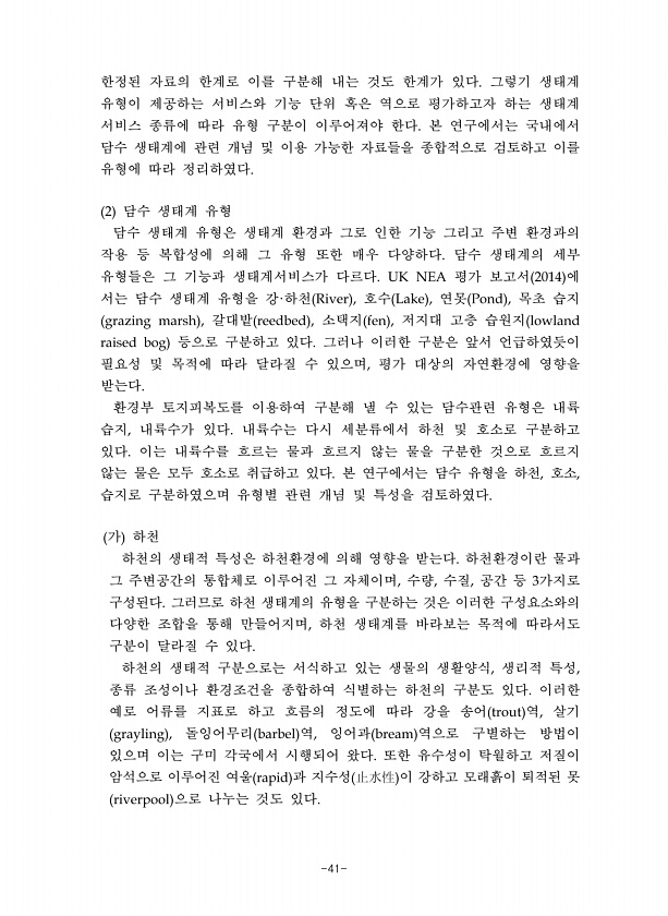 -41- 한정된 자료의 한계로 이를 구분해 내는 것도 한계가 있다 그렇기 생태계 유형이 제공하는 서비스와 기능 단위 혹은 역으로 평가하고자 하는 생태계 서비스 종류에 따라 유형 구분이 이루어져야 한다 본 연구에서는 국내에서 담수 생태계에 관련 개념 및 이용 가능한 자료들을 종합적으로 검토하고 이를 유형에 따라 정리하였다 담수 생태계 유형 담수 생태계 유형은 생태계 환경과 그로 인한 기능 그리고 주변 환경과의 작용 등 복합성에 의해 그 유형 또한 매우 다양하다 담수 생태계의 세부 유형들은 그 기능과 생태계서비스가 다르다 평가 보고서 에 서는 담수 생태계 유형을 강 하천 호수 연못 목초 습지 갈대밭 소택지 저지대 고층 습원지 등으로 구분하고 있다 그러나 이러한 구분은 앞서 언급하였듯이 필요성 및 목적에 따라 달...