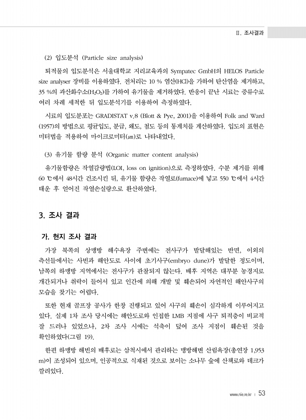 Ⅱ. 조사결과 www.nie.re.kr ? 53 2 입도분석 Particle size analysis 퇴적물의 입도분석은 서울대학교 지리교육과의 Sympatec GmbH의 HELOS Particle size analyser 장비를 이용하였다. 전처리는 10 % 염산 HCl 을 가하여 탄산염을 제거하고, 35 %의 과산화수소 H2O2 를 가하여 유기물을 제거하였다. 반응이 끝난 시료는 증류수로 여러 차례 세척한 뒤 입도분석기를 이용하여 측정하였다. 시료의 입도분포는 GRADISTAT v.8 Blott & Pye, 2001 을 이용하여 Folk and Ward 1957 의 방법으로 평균입도, 분급, 왜도, 첨도 등의 통계치를 계산하였다. 입도의 표현은 미터법을 적용하여 마이크로미터 ㎛ 로 나타내었다. 3 유기물...