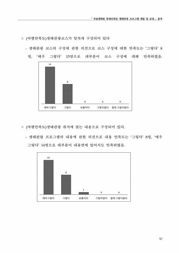 ?국립생태원 장애인대상 생태관광 프로그램 개발 및 운영? 용역 57 ? 여행만족도 생태관광코스가 알차게 구성되어 있다 생태관광 코스의 구성에 관한 의견으로 코스 구성에 대한 만족도는 ‘그렇다’ 8 명, ‘매우 그렇다’ 15명으로 대부분이 코스 구성에 대해 만족하였음. 15 8 0 0 0 매우그렇다 그렇다 보통이다 그렇지않다 절대 그렇지않다 ? 여행만족도 생태관광 취지에 맞는 내용으로 구성되어 있다. 생태관광 프로그램의 내용에 관한 의견으로 내용 만족도는 ‘그렇다’ 8명, ‘매우 그렇다’ 14명으로 대부분이 내용면에 있어서도 만족하였음. 14 8 1 0 0 매우그렇다 그렇다 보통이다 그렇지않다 절대그렇지않다
