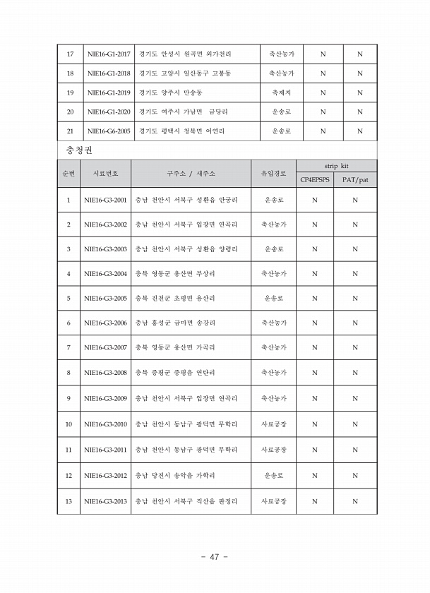 17 NIE16-G1-2017 경기도 안성시 원곡면 외가천리 축산농가 N N 18 NIE16-G1-2018 경기도 고양시 일산동구 고봉동 축산농가 N N 19 NIE16-G1-2019 경기도 양주시 만송동 축제지 N N 20 NIE16-G1-2020 경기도 여주시 가남면 금당리 운송로 N N 21 NIE16-G6-2005 경기도 평택시 청북면 어연리 운송로 N N 충청권 순번 시료번호 구주소 새주소 유입경로 strip kit CP4EPSPS PAT/pat 1 NIE16-G3-2001 충남 천안시 서북구 성환읍 안궁리 운송로 N N 2 NIE16-G3-2002 충남 천안시 서북구 입장면 연곡리 축산농가 N N 3 NIE16-G3-2003 충남 천안시 서북구 성환읍 양령리 운송로 N N 4 NIE16-G3-20...