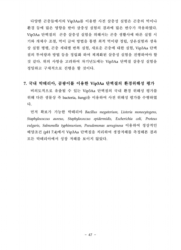 다양한 곤충들에서의 Vip3Aa를 이용한 사전 살충성 실험은 곤충의 먹이나 환경 등에 많은 영향을 받아 살충성 실험의 결과에 많은 변수가 작용하였다. Vip3Aa 단백질의 곤충 살충성 실험을 위해서는 곤충 생활사에 따른 실험 시 기와 개체수 조절, 먹이 급여 방법을 통한 최적 먹이량 정립, 상온실험과 생육 상 실험 병행, 곤충 세대별 반복 실험, 새로운 곤충에 대한 실험, Vip3Aa 단백 질의 투여량과 방법 등을 정립화 하여 체계화된 살충성 실험을 진행하여야 할 것 같다. 위의 사항을 고려하여 차기년도에는 Vip3Aa 단백질 살충성 실험을 정밀하고 구체적으로 진행을 할 것이다. 7. 국내 박테리아, 곰팡이를 이용한 Vip3Aa 단백질의 환경위해성 평가 비의도적으로 유출될 수 있는 Vip3Aa 단백질의 국내...