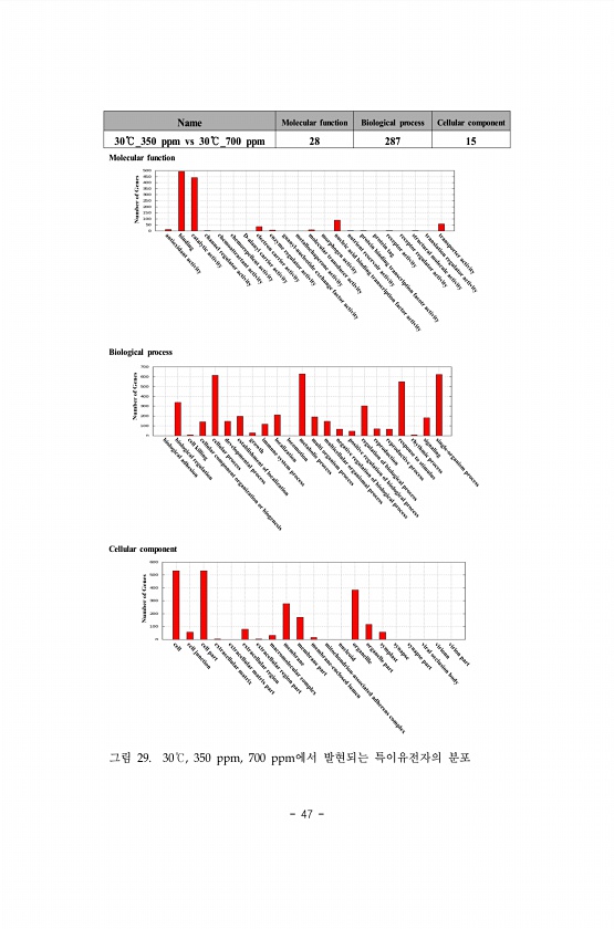 47 Name Molecular function Biological process Cellular component 30℃_350 ppm vs 30℃_700 ppm 28 287 15 Molecular function Biological process Cellular component 그림 29. 30℃, 350 ppm, 700 ppm에서 발현되는 특이유전자의분포