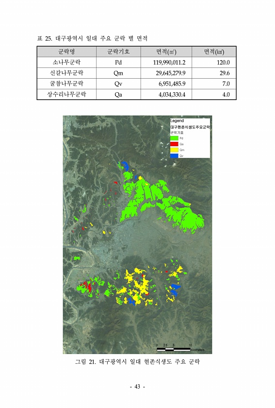 군락명 군락기호 면적 ㎡ 면적 ㎢ 소나무군락 Pd 119,990,011.2 120.0 신갈나무군락 Qm 29,645,279.9 29.6 굴참나무군락 Qv 6,951,485.9 7.0 상수리나무군락 Qa 4,034,330.4 4.0 표 25. 대구광역시 일대 주요 군락 별 면적 그림 21. 대구광역시 일대 현존식생도 주요 군락 43