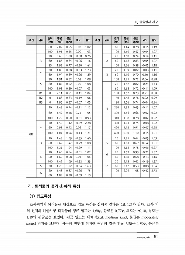 Ⅱ. 금일명사 사구 www.nie.re.kr ? 51 측선 위치 깊이 cm 평균 phi 분급 phi 왜도 첨도 측선 위치 cm 깊이 phi 평균 phi 분급 왜도 첨도 60 2.02 0.55 0.03 1.02 60 1.44 0.78 -0.15 1.19 100 1.91 0.55 0.00 1.03 100 1.60 0.57 -0.04 1.07 3 20 0.68 1.88 -0.38 0.76 2 20 1.58 0.74 -0.14 1.11 60 1.86 0.64 -0.06 1.16 60 1.12 0.83 -0.05 1.07 85 1.92 0.77 -0.20 1.41 100 1.66 0.58 -0.05 1.18 4 20 1.88 0.88 -0.33 1.73 3 20 1.39 0.82 -0.03 1.11 60 1.94 0...