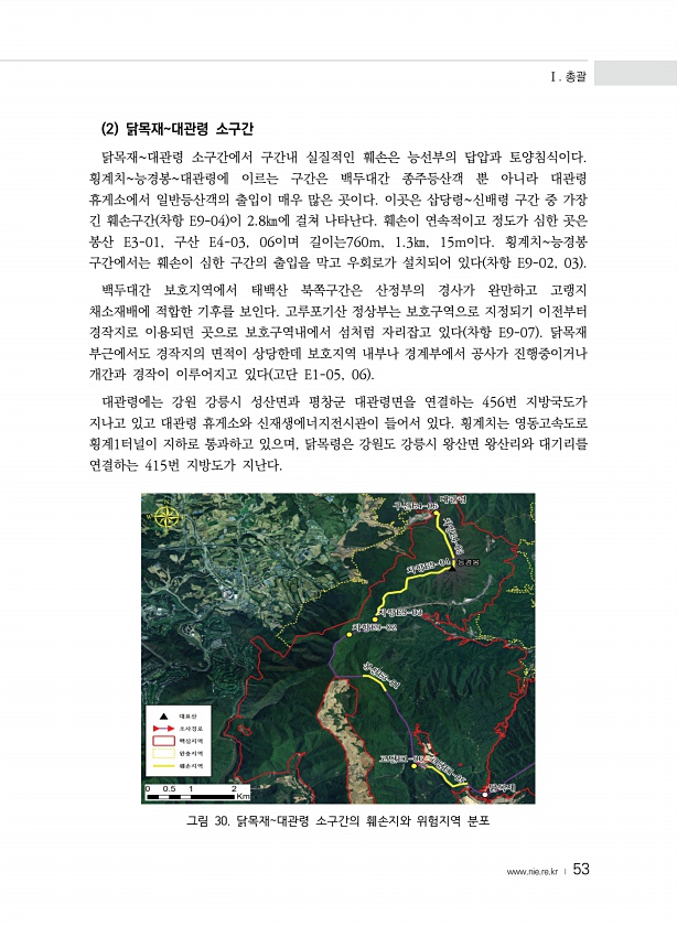 Ⅰ. 총괄 www.nie.re.kr ? 53 2 닭목재대관령 소구간 닭목재대관령 소구간에서 구간내 실질적인 훼손은 능선부의 답압과 토양침식이다. 횡계치능경봉대관령에 이르는 구간은 백두대간 종주등산객 뿐 아니라 대관령 휴게소에서 일반등산객의 출입이 매우 많은 곳이다. 이곳은 삽당령신배령 구간 중 가장 긴 훼손구간 차항 E9-04 이 2.8㎞에 걸쳐 나타난다. 훼손이 연속적이고 정도가 심한 곳은 봉산 E3-01, 구산 E4-03, 06이며 길이는760m, 1.3㎞, 15m이다. 횡계치능경봉 구간에서는 훼손이 심한 구간의 출입을 막고 우회로가 설치되어 있다 차항 E9-02, 03 백두대간 보호지역에서 태백산 북쪽구간은 산정부의 경사가 완만하고 고랭지 채소재배에 적합한 기후를 보인다. 고루포기산 정상부는 보호구역으...