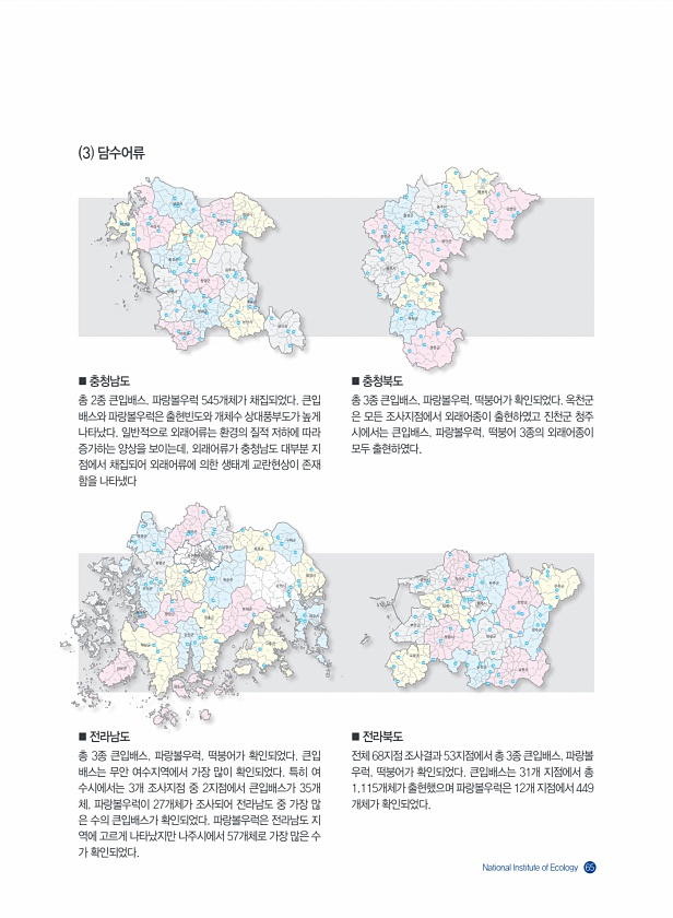 National Institute of Ecology 65 3 담수어류 ■ 전라남도 총 3종 큰입배스, 파랑볼우럭, 떡붕어가 확인되었다. 큰입 배스는 무안 여수지역에서 가장 많이 확인되었다. 특히 여 수시에서는 3개 조사지점 중 2지점에서 큰입배스가 35개 체, 파랑볼우럭이 27개체가 조사되어 전라남도 중 가장 많 은 수의 큰입배스가 확인되었다. 파랑볼우럭은 전라남도 지 역에 고르게 나타났지만 나주시에서 57개체로 가장 많은 수 가 확인되었다. ■ 충청남도 총 2종 큰입배스, 파랑볼우럭 545개체가 채집되었다. 큰입 배스와 파랑볼우럭은 출현빈도와 개체수 상대풍부도가 높게 나타났다. 일반적으로 외래어류는 환경의 질적 저하에 따라 증가하는 양상을 보이는데, 외래어류가 충청남도 대부분 지 점에서 채집되어 외래어류...