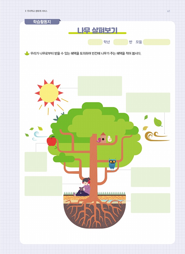 학습활동지 나무 살펴보기 학년 반 모둠 우리가 나무로부터 받을 수 있는 혜택을 토의하여 빈칸에 나무가 주는 혜택을 적어 봅시다. Ⅱ 우리학교 생태계 서비스61