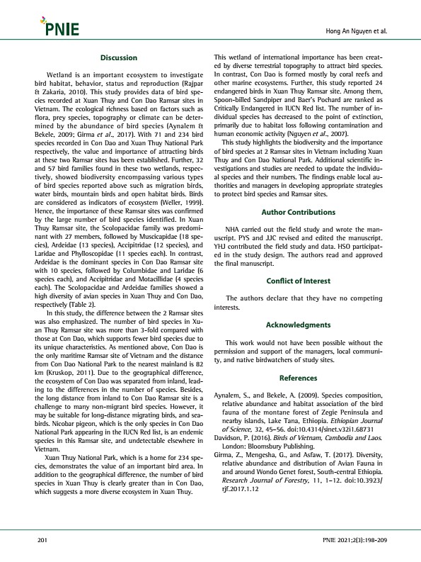 Discussion Wetland is an important ecosystem to investigate bird habitat, behavior, status and reproduction Rajpar & Zakaria, 2010 This study provides data of bird species recorded at Xuan Thuy and Con Dao Ramsar sites in Vietnam. The ecological richness based on factors such as flora, prey species, topography or climate can be determined by the abundance of bird species Aynalem & Bekele, 2009; Gi...