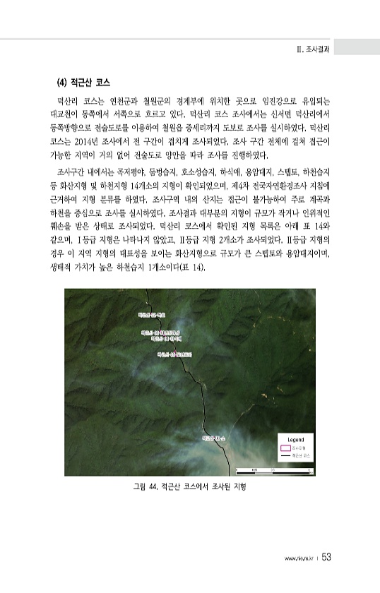 Ⅱ. 조사결과 www.nie.re.kr ? 53 4 적근산 코스 덕산리 코스는 연천군과 철원군의 경계부에 위치한 곳으로 임진강으로 유입되는 대교천이 동쪽에서 서쪽으로 흐르고 있다. 덕산리 코스 조사에서는 신서면 덕산리에서 동쪽방향으로 전술도로를 이용하여 철원읍 중세리까지 도보로 조사를 실시하였다. 덕산리 코스는 2014년 조사에서 전 구간이 겹치게 조사되었다. 조사 구간 전체에 걸쳐 접근이 가능한 지역이 거의 없어 전술도로 양안을 따라 조사를 진행하였다. 조사구간 내에서는 곡저평야, 둠벙습지, 호소성습지, 하식애, 용암대지, 스텝토, 하천습지 등 화산지형 및 하천지형 14개소의 지형이 확인되었으며, 제4차 전국자연환경조사 지침에 근거하여 지형 분류를 하였다. 조사구역 내의 산지는 접근이 불가능하여 주로 계곡...