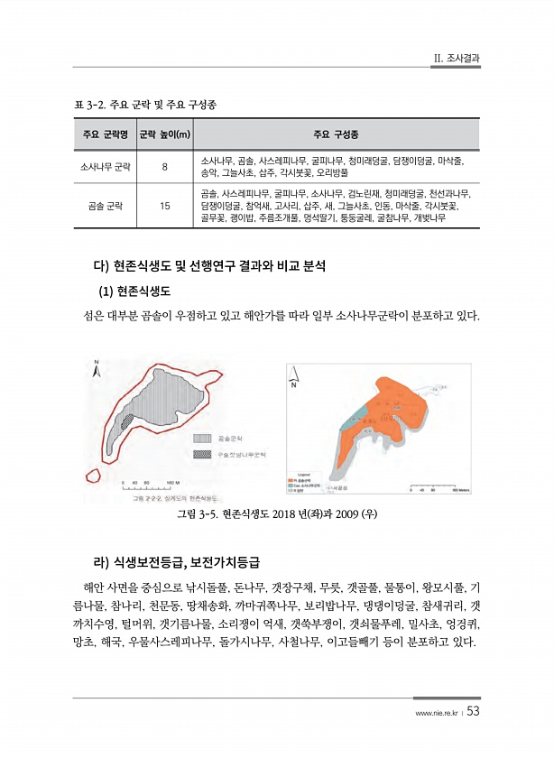 II. 조사결과 www.nie.re.kr ? 53 주요 군락명 군락 높이 m 주요 구성종 소사나무 군락 8 소사나무, 곰솔, 사스레피나무, 굴피나무, 청미래덩굴, 담쟁이덩굴, 마삭줄, 송악, 그늘사초, 삽주, 각시붓꽃, 오리방풀 곰솔 군락 15 곰솔, 사스레피나무, 굴피나무, 소사나무, 검노린재, 청미래덩굴, 천선과나무, 담쟁이덩굴, 참억새, 고사리, 삽주, 새, 그늘사초, 인동, 마삭줄, 각시붓꽃, 골무꽃, 괭이밥, 주름조개풀, 멍석딸기, 퉁둥굴레, 굴참나무, 개벚나무 표 3-2. 주요 군락 및 주요 구성종 1 섬은 대부분 곰솔이 우점하고 있고 해안가를 따라 일부 소사나무군락이 분포하고 있다. 그림 3-5. 현존식생도 2018 년 좌 과 2009 우 , 해안 사면을 중심으로 낚시돌풀, 돈나무, 갯장구채, ...