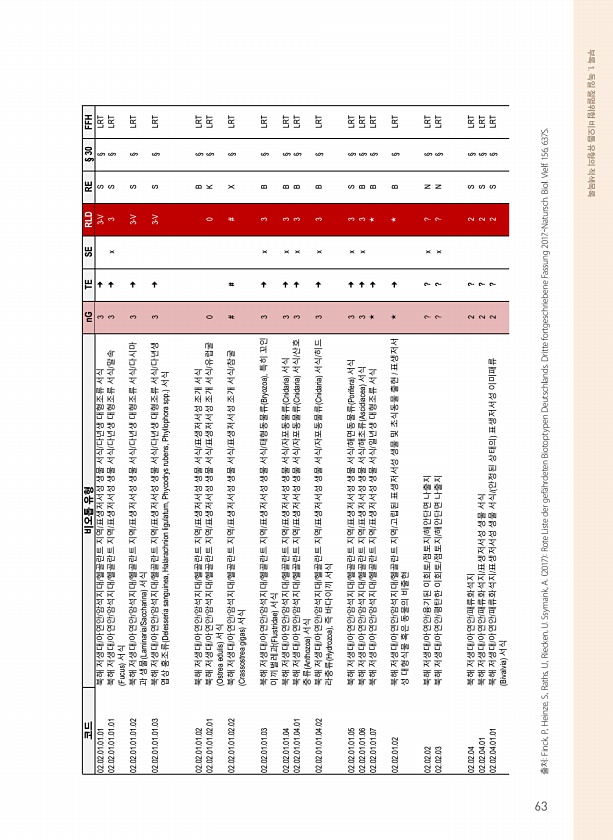 부록 1. 독일 절멸위험 비오톱 유형의 적색목록 출처Finck, P., Heinze, S., Raths, U., Riecken, U. Ssymank, A. 2017 Rote Liste der gef?hrdeten Biotoptypen Deutschlands. Dritte fortgeschriebene Fassung 2017.-Natursch. Biol. Vielf. 156, 637S. 코드 비오톱 유형 nG TE SE RLD RE § 30 FFH 02.02.01.01.01 북해 저생대/아연안/암석지대/헬골란트 지역/표생저서성 생물 서식/다년생 대형조류 서식 3 ? 3-V S § LRT 02.02.01.01.01.01 북해 저생대/아연안/암석지대/헬골란트 지역/표생저서성 생물 서식/다년생 대형조류 서식/말속 ...
