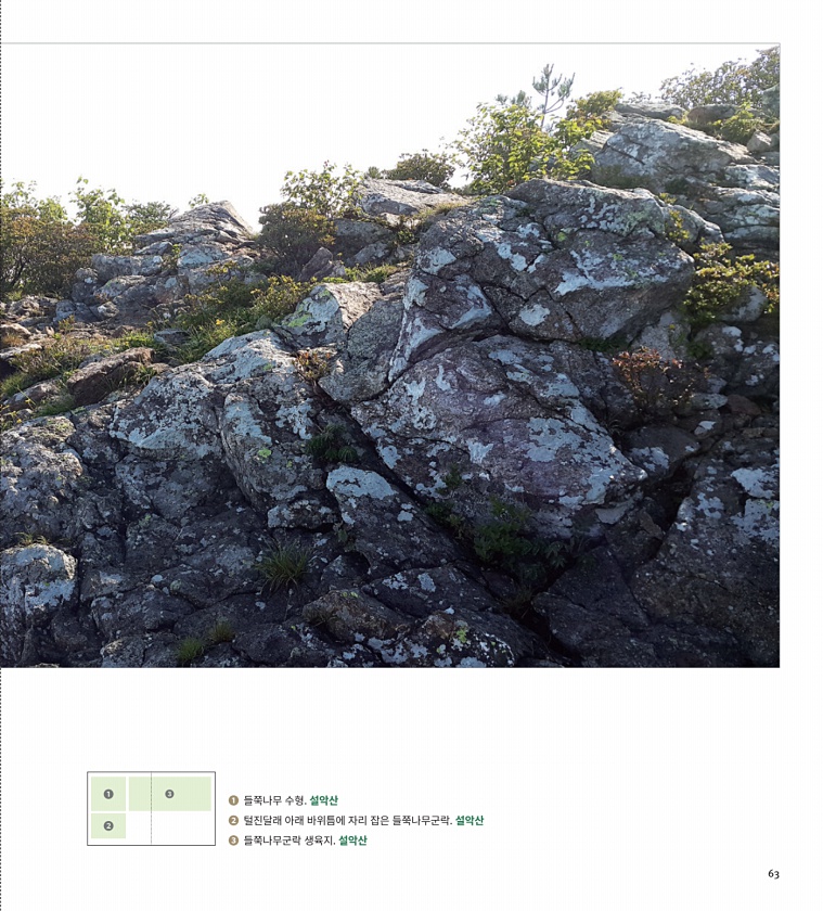 ? ? ? ? 들쭉나무 수형. 설악산 ? 털진달래 아래 바위틈에 자리 잡은 들쭉나무군락. 설악산 ? 들쭉나무군락 생육지. 설악산63