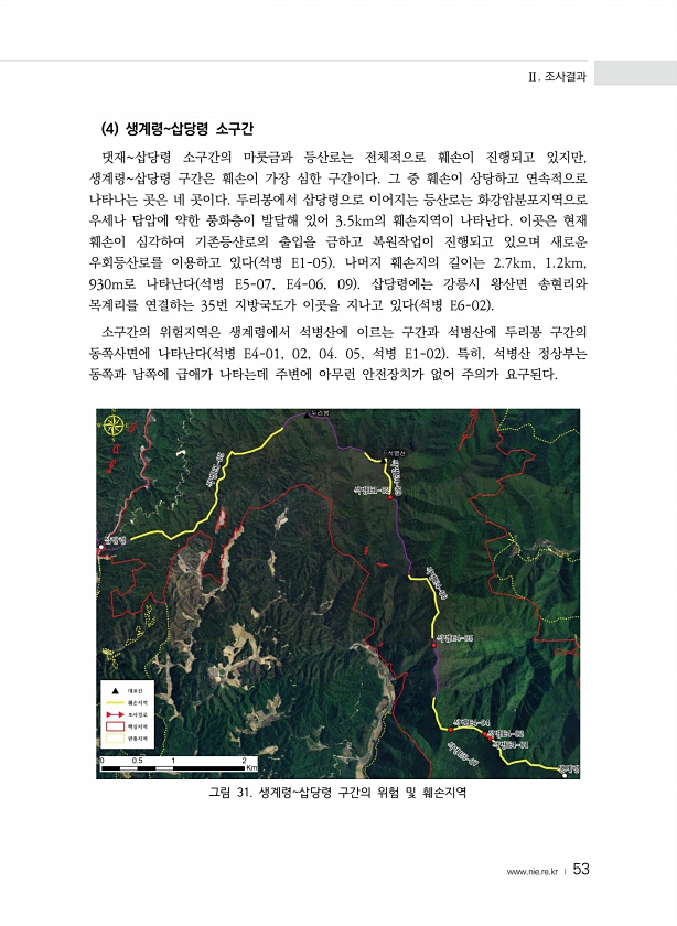 Ⅱ. 조사결과 www.nie.re.kr ? 53 4 생계령삽당령 소구간 댓재삽당령 소구간의 마룻금과 등산로는 전체적으로 훼손이 진행되고 있지만, 생계령삽당령 구간은 훼손이 가장 심한 구간이다. 그 중 훼손이 상당하고 연속적으로 나타나는 곳은 네 곳이다. 두리봉에서 삽당령으로 이어지는 등산로는 화강암분포지역으로 우세나 답압에 약한 풍화층이 발달해 있어 3.5km의 훼손지역이 나타난다. 이곳은 현재 훼손이 심각하여 기존등산로의 출입을 금하고 복원작업이 진행되고 있으며 새로운 우회등산로를 이용하고 있다 석병 E1-05 나머지 훼손지의 길이는 2.7km, 1.2km, 930m로 나타난다 석병 E5-07, E4-06, 09 삽당령에는 강릉시 왕산면 송현리와 목계리를 연결하는 35번 지방국도가 이곳을 지나고 있다 석병...