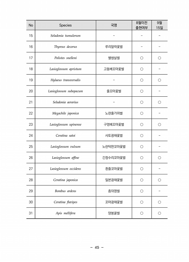 45 No Species 국명 8월이전 출현여부 9월 15일 15 Seladonia tumulorum 16 Thyreus decorus 루리알락꽃벌 17 Polistes snelleni 별쌍살벌 ○ ○ 18 Lasioglossum apristum 고동배꼬마꽃벌 ○ 19 Hylaeus transversalis ○ ○ 20 Lasioglossum subopacum 줄꼬마꽃벌 ○ 21 Seladonia aerarius ○ ○ 22 Megachile japonica 노란줄가위벌 ○ 23 Lasioglossum upinense 구멍배꼬마꽃벌 ○ ○ 24 Ceratina satoi 사토광채꽃벌 ○ 25 Lasioglossum vulsum 노란턱판꼬마꽃벌 ○ 26 Lasioglossum affine 긴정수리꼬마꽃벌 ○ ...