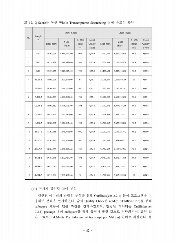 42 12. Q-Score Whole Transcriptome Sequencing Cufflinks ver 2.2.1 Quality Check read STAR ver 2.5 reference , Cufflinks ver 2.2.1 package cuffquant , FPKM FraLMents Per Kilobase of transcript per Million No. Sample ID. Raw Reads Clean Reads Read-pairs Yield base ≥ Q30 Bases % Mean Quality Score Read-pairs Yield base ≥ Q30 Bases % Mean Quality Score 1 NT1 34,402,796 6,880,559,200 90.5 Q35.0 34,402,...