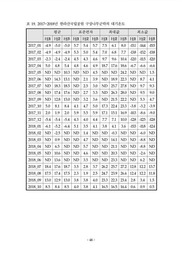 48 평균 표준편차 최대값 최소값 H_01 H_02 H_03 H_01 H_02 H_03 H_01 H_02 H_03 H_01 H_02 H_03 2017_01 -4.9 -5.0 -5.0 5.7 5.4 5.7 7.5 6.1 8.0 -15.1 -14.4 -15.5 2017_02 -4.9 -4.9 -4.9 5.3 5.0 5.4 7.0 6.8 7.7 -13.8 -13.2 -13.8 2017_03 -2.3 -2.4 -2.4 4.5 4.3 4.6 9.7 9.6 10.4 -12.0 -11.5 -12.0 2017_04 5.0 4.8 5.4 4.8 4.6 4.9 18.7 17.6 18.6 -6.7 -6.6 -6.6 2017_05 ND ND 10.3 ND ND 4.5 ND ND 24.2 ND ND 1.5 2017_06 ND 14...