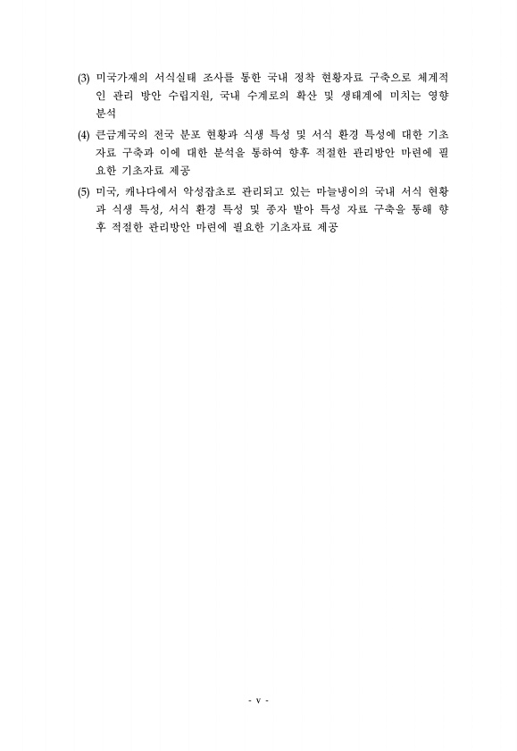 v 3 미국가재의 서식실태 조사를 통한 국내 정착 현황자료 구축으로 체계적 인 관리 방안 수립지원, 국내 수계로의 확산 및 생태계에 미치는 영향 분석 4 큰금계국의 전국 분포 현황과 식생 특성 및 서식 환경 특성에 대한 기초 자료 구축과 이에 대한 분석을 통하여 향후 적절한 관리방안 마련에 필 요한 기초자료 제공 5 미국, 캐나다에서 악성잡초로 관리되고 있는 마늘냉이의 국내 서식 현황 과 식생 특성, 서식 환경 특성 및 종자 발아 특성 자료 구축을 통해 향 후 적절한 관리방안 마련에 필요한 기초자료제공