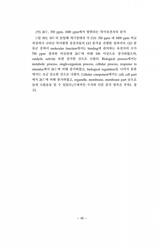 48 마 26℃, 350 ppm, 1000 ppm에서 발현되는 특이유전자의 분석 그림 30는 30℃의 21일째 애기장대의 각 CO2 350 ppm 대 1000 ppm 비교 과정에서 나타난 특이발현 유전자들의 GO 분석을 진행한 결과이다. GO 분 류군 중에서 molecular function에서는 binding에 관여하는 유전자의 수가 700 ppm 결과와 비슷하게 26℃에 비해 100 이상으로 증가하였으며, catalytic activity 또한 증가한 것으로 나왔다. Biological process에서는 metabolic process, single-organism process, cellular process, response to stimulus에서 26℃에 비해 증가하였고, biological r...