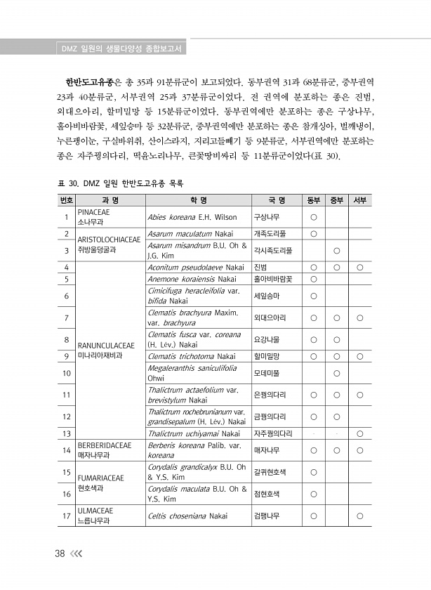 DMZ 일원의 생물다양성 종합보고서 38 번호 과 명 학 명 국 명 동부 중부 서부 1 PINACEAE 소나무과 Abies koreana E.H. Wilson 구상나무 ○ 2 ARISTOLOCHIACEAE 쥐방울덩굴과 Asarum maculatum Nakai 개족도리풀 ○ 3 Asarum misandrum B.U. Oh & J.G. Kim 각시족도리풀 ○ 4 RANUNCULACEAE 미나리아재비과 Aconitum pseudolaeve Nakai 진범 ○ ○ ○ 5 Anemone koraiensis Nakai 홀아비바람꽃 ○ 6 Cimicifuga heracleifolia var. bifida Nakai 세잎승마 ○ 7 Clematis brachyura Maxim. var. brachyura 외대으아리 ○ ○...