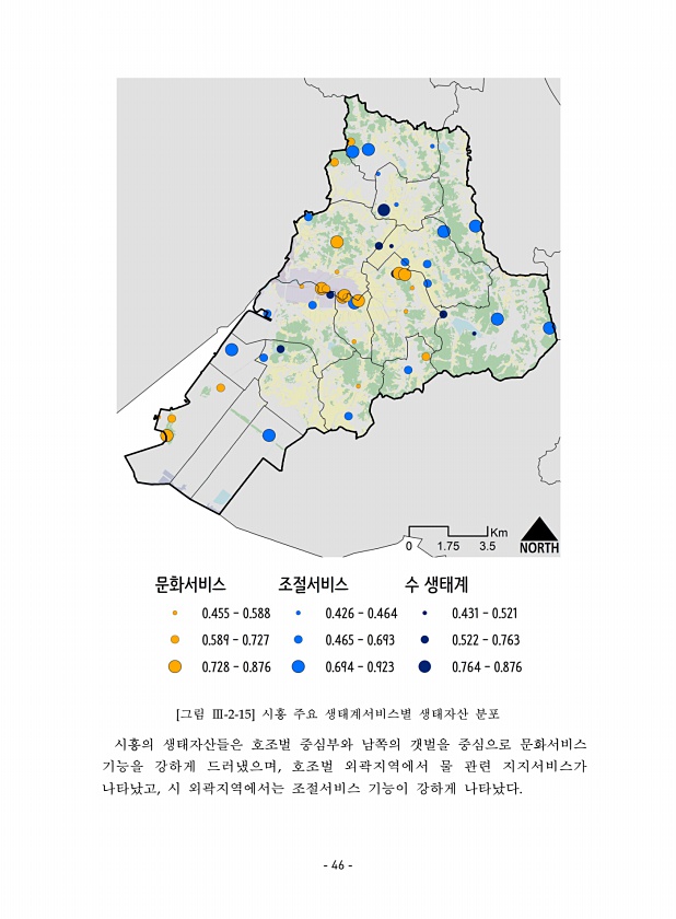 [그림 Ⅲ-2-15] 시흥 주요 생태계서비스별 생태자산 분포 시흥의 생태자산들은 호조벌 중심부와 남쪽의 갯벌을 중심으로 문화서비스 기능을 강하게 드러냈으며, 호조벌 외곽지역에서 물 관련 지지서비스가 나타났고, 시 외곽지역에서는 조절서비스 기능이 강하게 나타났다. 46