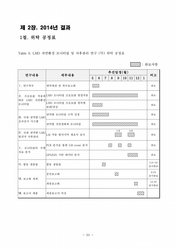 53 제 2장. 2014년 결과 1절. 위탁 공정표 연구내용 세부내용 추진일정 월 비고 5 6 7 8 9 10 11 12 1 Ⅰ. 연구착수 계약체결 및 착수보고회 완료 Ⅱ. 프로토콜 적용에 따른 LMO 자연환경 모니터링 LMO 모니터링 프로토콜 현장적용 완료 LMO 모니터링 프로토콜 항목별 보완/점검 완료 Ⅲ. 국내 권역별 LMO 조사감시 시스템 권역별 모니터링 구역 선정 완료 권역별 자연생태계 모니터링 완료 Ⅳ. 국내 권역별 LMO 발견지 사후관리 LM 작물 발견지역 재조사 실시 1차 2차 완료 Ⅴ. 모니터링의 수행 자료 분석 PCR 분석을 통한 LM event 분석 완료 GPS/GIS 기반 데이터 분석 완료 Ⅵ. 합동 샘플링 합동 샘플링 7.910 실시완료 Ⅶ. 보고회 개최 중간보고회 9.16 실시완료 ...