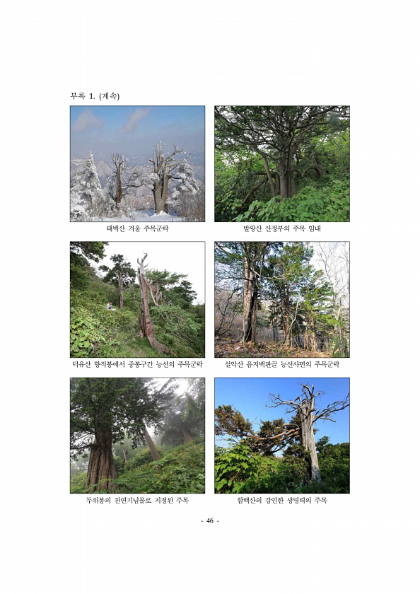46 l 태백산 겨울 주목군락 발왕산 산정부의 주목 임내 덕유산 향적봉에서 중봉구간 능선의 주목군락 설악산 음지백판골 능선사면의 주목군락 두위봉의 천연기념물로 지정된 주목 함백산의 강인한 생명력의 주목 부록 1. 계속