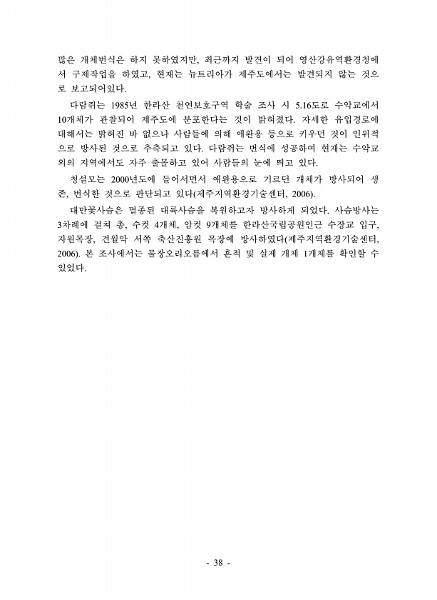 38 많은 개체번식은 하지 못하였지만, 최근까지 발견이 되어 영산강유역환경청에 서 구제작업을 하였고, 현재는 뉴트리아가 제주도에서는 발견되지 않는 것으 로 보고되어있다. 다람쥐는 1985년 한라산 천연보호구역 학술 조사 시 5.16도로 수악교에서 10개체가 관찰되어 제주도에 분포한다는 것이 밝혀졌다. 자세한 유입경로에 대해서는 밝혀진 바 없으나 사람들에 의해 애완용 등으로 키우던 것이 인위적 으로 방사된 것으로 추측되고 있다. 다람쥐는 번식에 성공하여 현재는 수악교 외의 지역에서도 자주 출몰하고 있어 사람들의 눈에 띄고 있다. 청설모는 2000년도에 들어서면서 애완용으로 기르던 개체가 방사되어 생 존, 번식한 것으로 판단되고 있다 제주지역환경기술센터, 2006 대만꽃사슴은 멸종된 대륙사슴을 복원하고자 방사하...