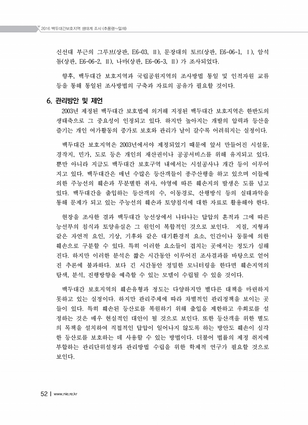 2016 백두대간보호지역 생태계 조사 추풍령밀재 52Ⅰwww.nie.re.kr 신선대 부근의 그루브 상판, E6-03, Ⅱ , 문장대의 토르 상판, E6-06-1, Ⅰ , 암석 돔 상판, E6-06-2, Ⅱ , 나마 상판, E6-06-3, Ⅱ 가 조사되었다. 향후, 백두대간 보호지역과 국립공원지역의 조사방법 통일 및 인적자원 교류 등을 통해 통일된 조사방법의 구축과 자료의 공유가 필요할 것이다. 6. 관리방안 및 제언 2003년 제정된 백두대간 보호법에 의거해 지정된 백두대간 보호지역은 한반도의 생태축으로 그 중요성이 인정되고 있다. 하지만 높아지는 개발의 압력과 등산을 즐기는 개인 여가활동의 증가로 보호와 관리가 날이 갈수록 어려워지는 실정이다. 백두대간 보호지역은 2003년에서야 제정되었기 때문에 앞서 ...
