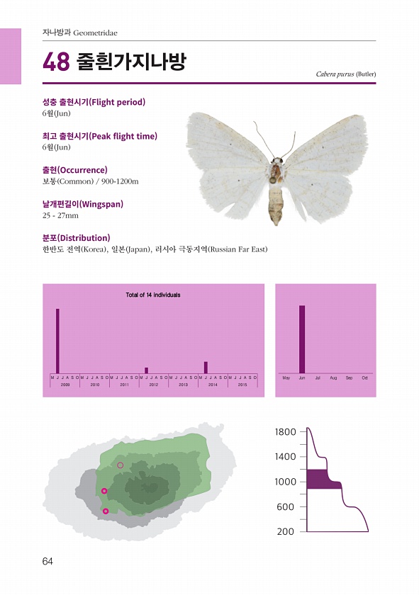 64 자나방과 Geometridae Cabera purus Butler M J J A S O M J J A S O M J J A S O M J J A S O M J J A S O M J J A S O M J J A S O May Jun Jul Aug Sep Oct 2009 2010 2011 2012 2013 2014 2015 Total of 14 individuals 성충 출현시기 Flight period 6월 Jun 최고 출현시기 Peak fight time 6월 Jun 출현 Occurrence 보통 Common 900-1200m 날개편길이 Wingspan 25 27mm 분포 Distribution 한반도 전역 Korea , 일본 Japan , 러시아 극동지역 Russian Far East 48줄흰가지나방