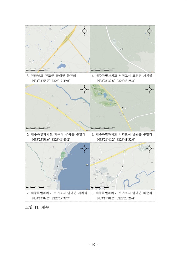 40 3. 전라남도 진도군 군내면 둔전리 N34˚31´55.7˝ E126˚17´49.0˝ 4. 제주특별자치도 서귀포시 표선면 가시리 N33˚23´32.8˝ E126˚43´28.3˝ 5. 제주특별자치도 제주시 구좌읍 송당리 N33˚25´56.6˝ E126˚44´43.2˝ 6. 제주특별자치도 서귀포시 남원읍 수망리 N33˚21´40.2˝ E126˚41´32.0˝ 7. 제주특별자치도 서귀포시 안덕면 사계리 N33˚13´09.2˝ E126˚17´37.7˝ 8. 제주특별자치도 서귀포시 안덕면 화순리 N33˚15´04.2˝ E126˚20´26.4˝ 그림 11.계속