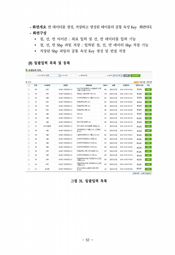 52 화면개요 면 데이터를 생성, 저장하고 생성된 테이블의 공통 속성 Key 화면이다. 화면구성 ? 점, 선, 면 아이콘 좌표 입력 및 선, 면 데이터를 입력 기능 ? 점, 선, 면 Shp 파일 저장 입력된 점, 선, 면 데이터 Shp 저장 기능 ? 저장된 Shp 파일의 공통 속성 Key 생성 및 편집 저장 8 일괄입력 목록 및 등록 홍길동 홍길동 홍길동 홍길동 홍길동 홍길동 홍길동 홍길동 홍길동 홍길동 홍길동 홍길동 홍길동 홍길동 홍길동 홍길동 홍길동 홍길동 홍길동 홍길동 그림 31. 일괄입력목록